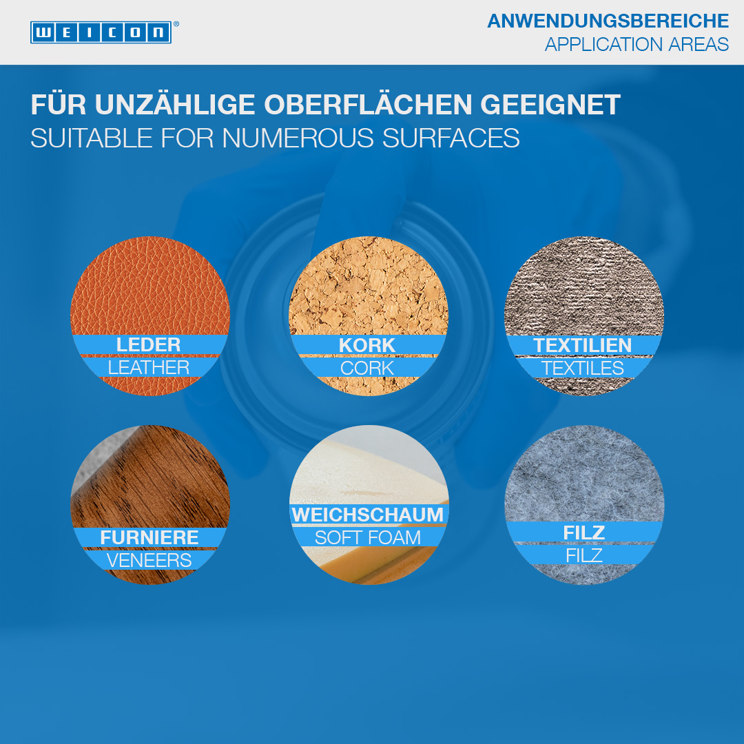 WEICON喷胶用途广泛,适用于轻质材料的同材及异材粘接。 该产品可用于多种材质,如纸、纸箱、硬纸板、木材、薄木片、软木塞、皮革、纺织品、毡制品、软质泡沫、橡胶、泡沫橡胶及塑料薄膜(聚氯乙烯和聚乙烯除外)等。尤其适合硬质泡沫(如聚苯乙烯)的粘接。