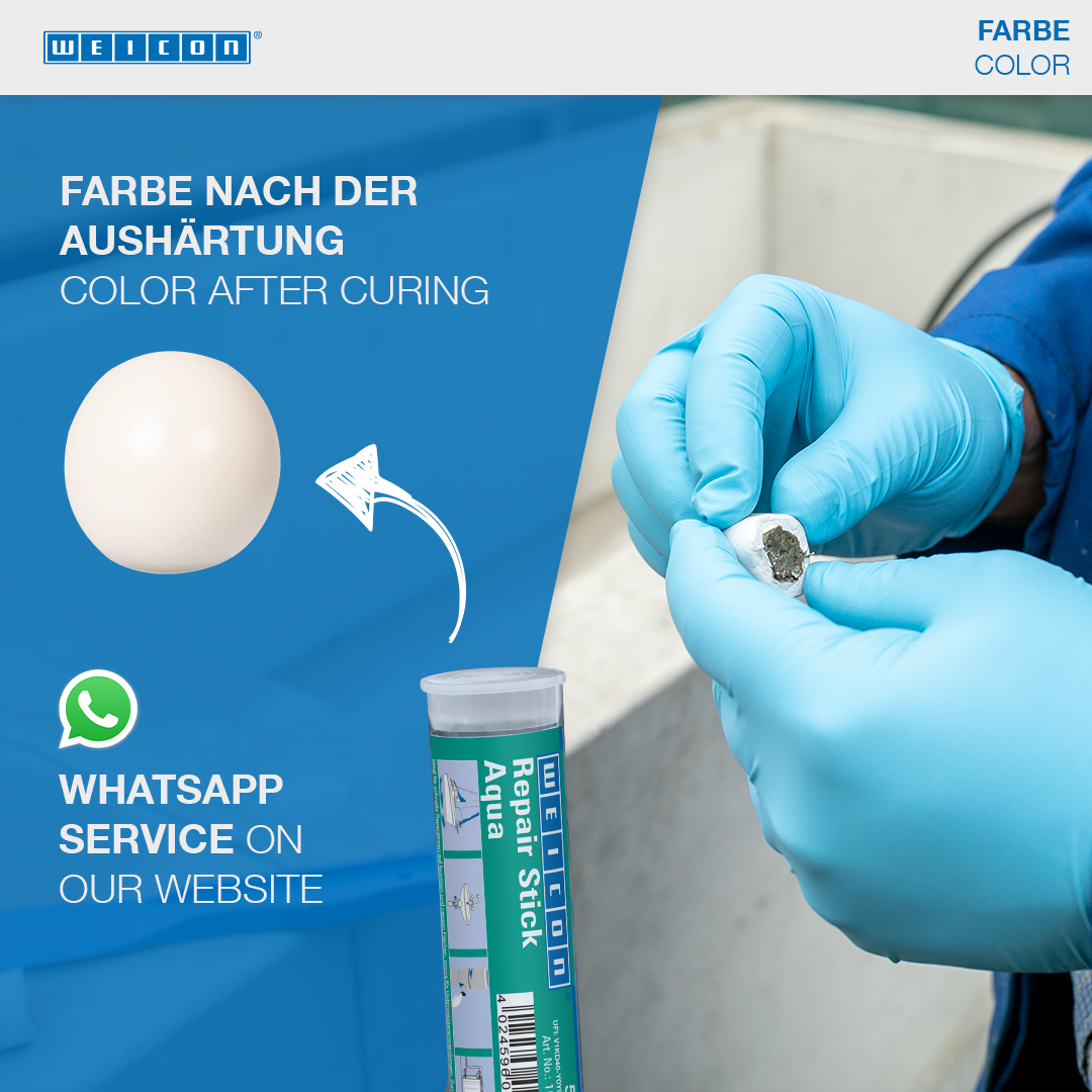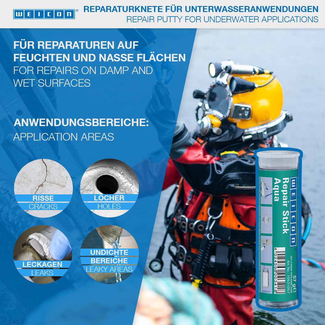 耐水型修补胶棒是潮湿表面和水下快速修复的理想产品。 它能够修复并密封油箱/水箱、暖气片、电子开关、卫生设备和游泳池中的裂缝、孔隙及泄漏。 WEICON 耐水型修补胶棒适用于卫生设备与供暖系统的制造、电子工业、海事领域及其他诸多工业领域。