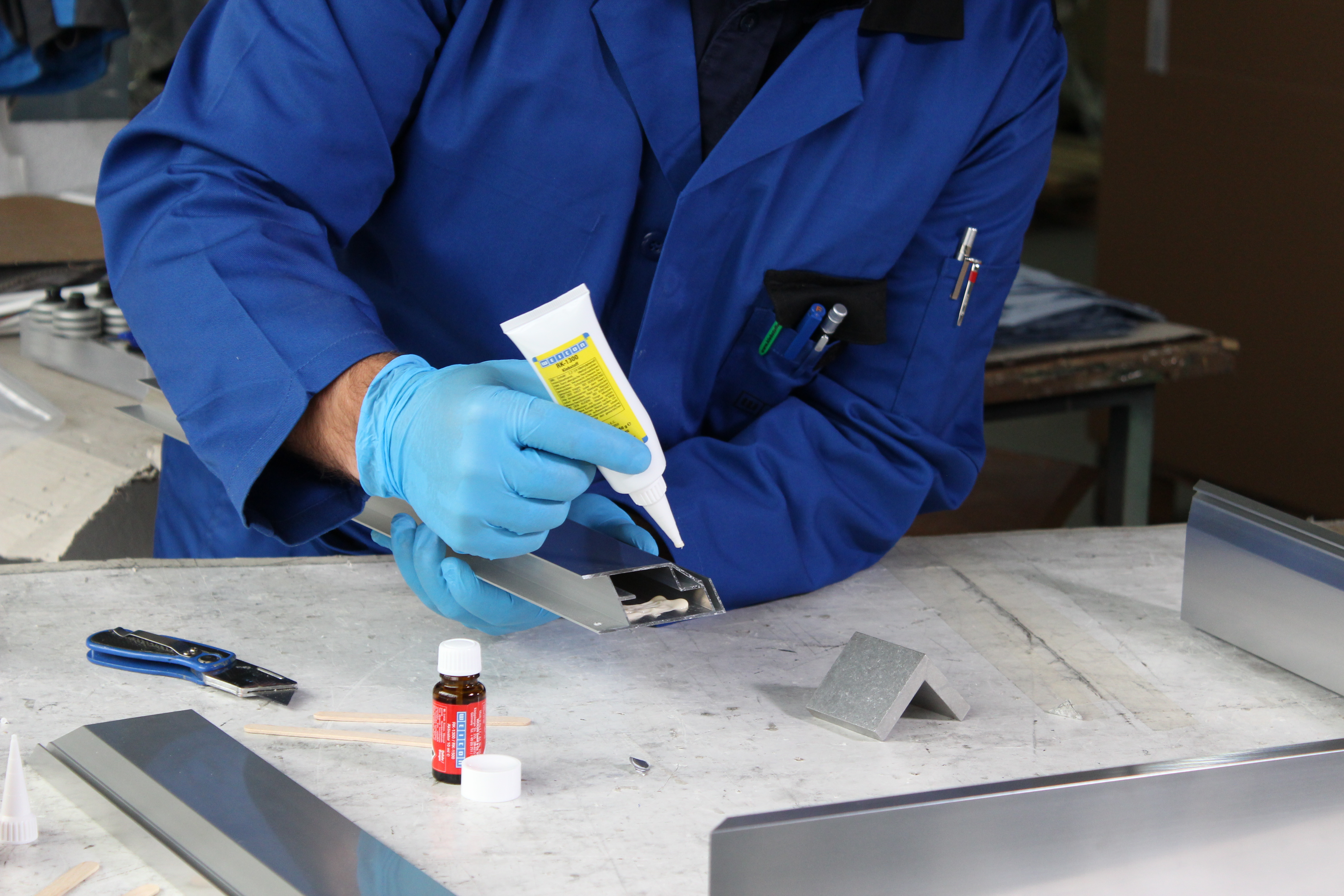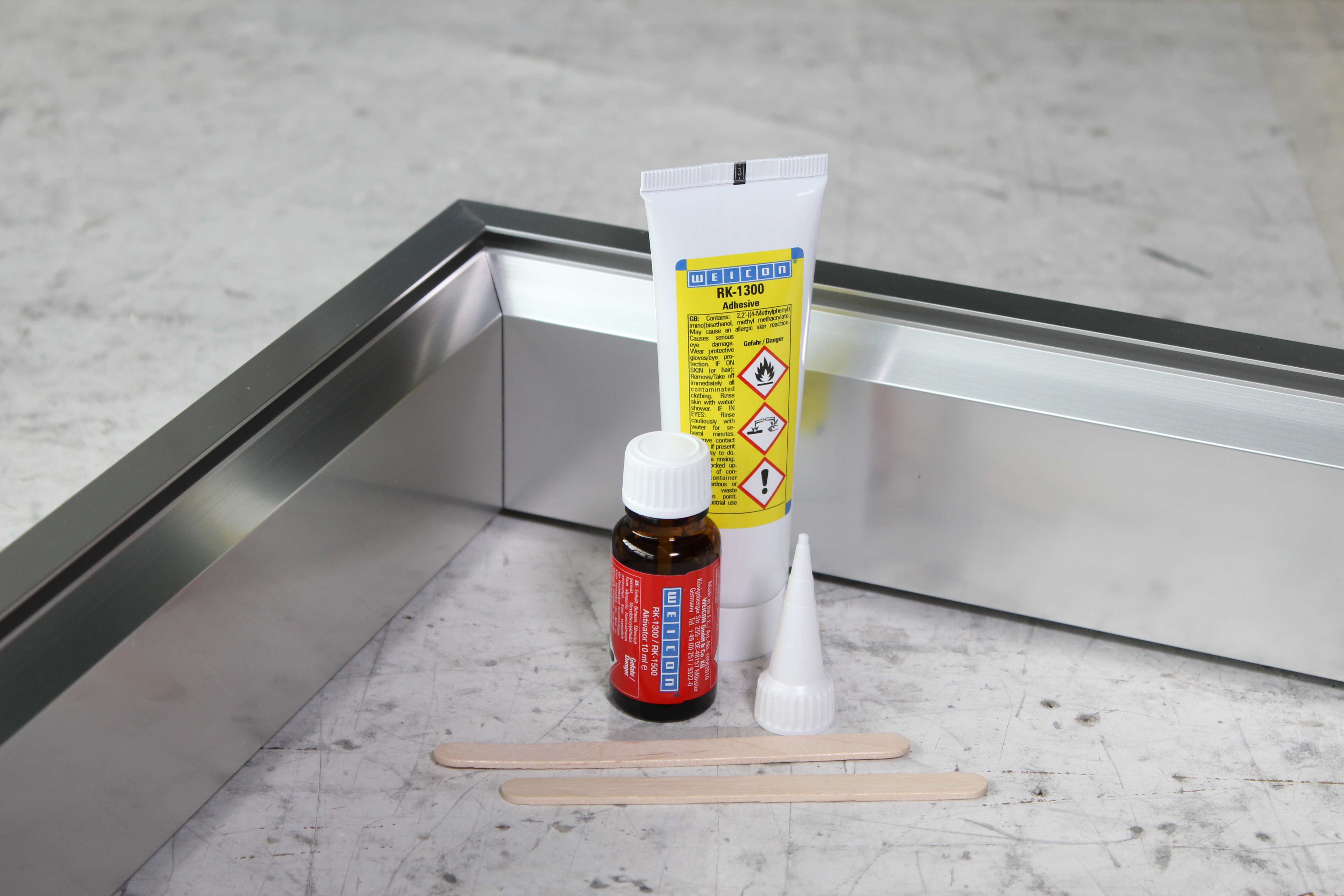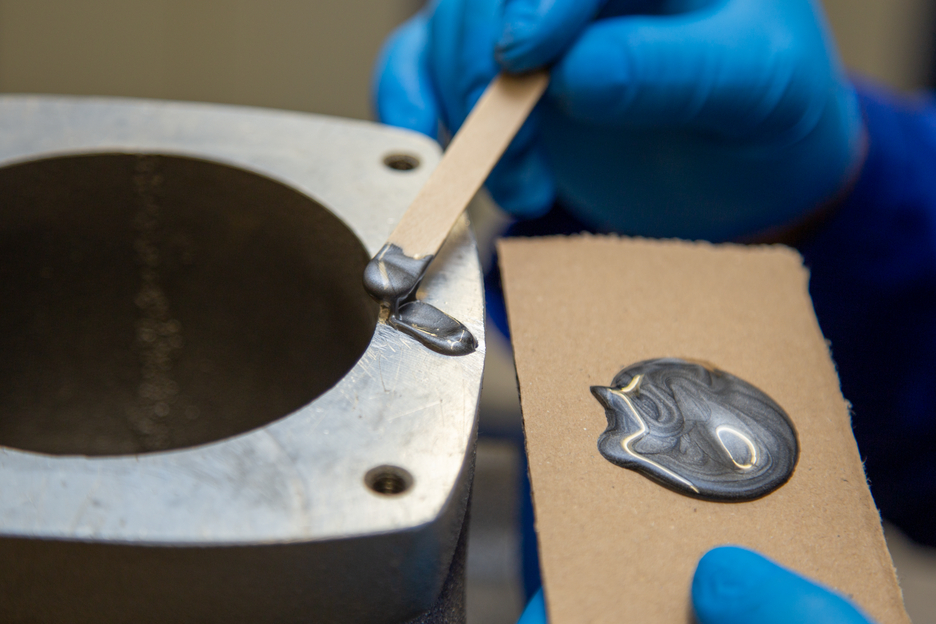 用于铝材与其他轻金属进行同材和异材粘接的粘合剂WEICON 铝填充快速环氧粘合剂可用于填充铝制外壳等的裂缝与孔洞,以及用于维修轻金属轮。 该双组份环氧树脂粘合剂由铝填充,低气味,耐温高达+180 °C,且室温下即可快速固化。固化后,该粘合剂可接受机械性加工,即锉削、钻孔或铣削。该铝填充快速环氧粘合剂可用于填充缝隙,不流淌(触变性),且具有很高的抗拉伸与抗冲击强度。为了实现最佳粘合效果,待粘接表面应干燥、无油脂、无脏污。在清洁前刮擦或打磨表面做粗糙处理,有助于确保良好的附着力。
