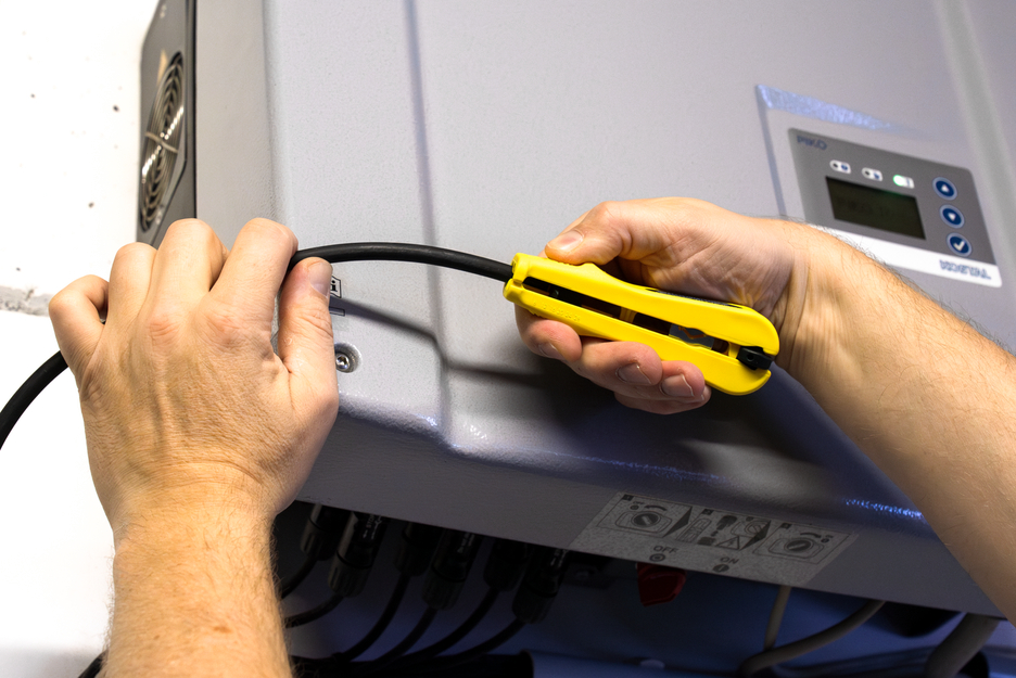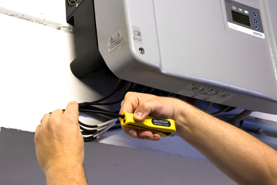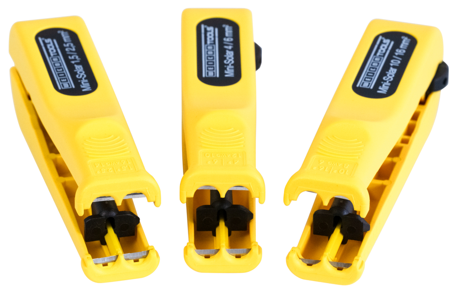 迷你太阳能 4/6 mm² 剥皮器可快速、轻松地为横截面在4至6mm²之间的通用光伏线缆进行剥皮和剥线操作。无需调整切割深度。该工具可对剥线长度进行调节,范围为 6-28 毫米。此外,玻璃纤维增强剥皮器内置侧刀,最大切割截面可至 10 mm² 。在剥线时,该工具总能实现精准的切割截面。此外,迷你太阳能 4/6 mm² 剥皮器在使用结束后可锁住手柄,节约存放空间。