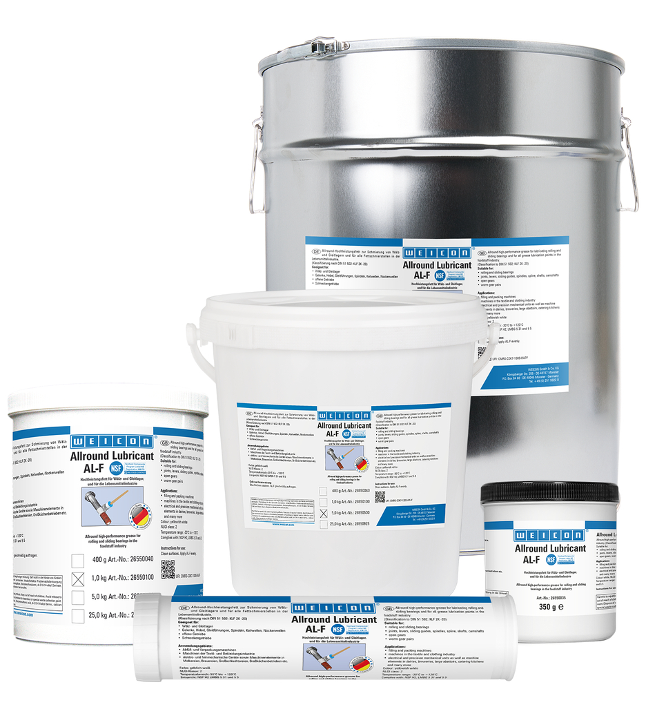 WEICON高效润滑脂AL-F可用于润滑滚动和滑动轴承、关节接头、杠杆、滑道、主轴、花键轴、凸轮轴、开式齿轮、蜗轮,以及所有适合使用脂类润滑剂的地方。经美国国家卫生基金会NSF的H2级认证,该润滑脂适用于食品工业。