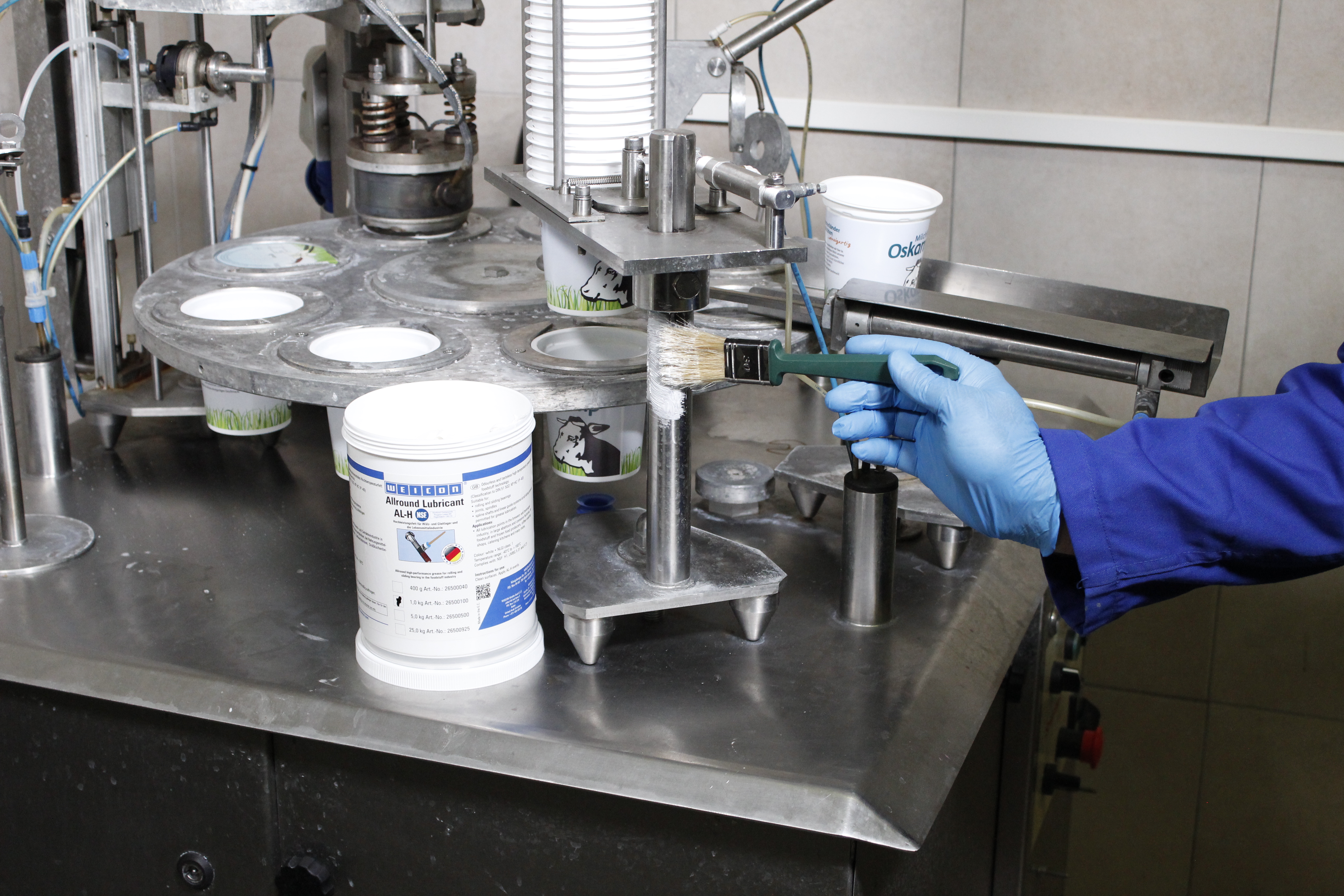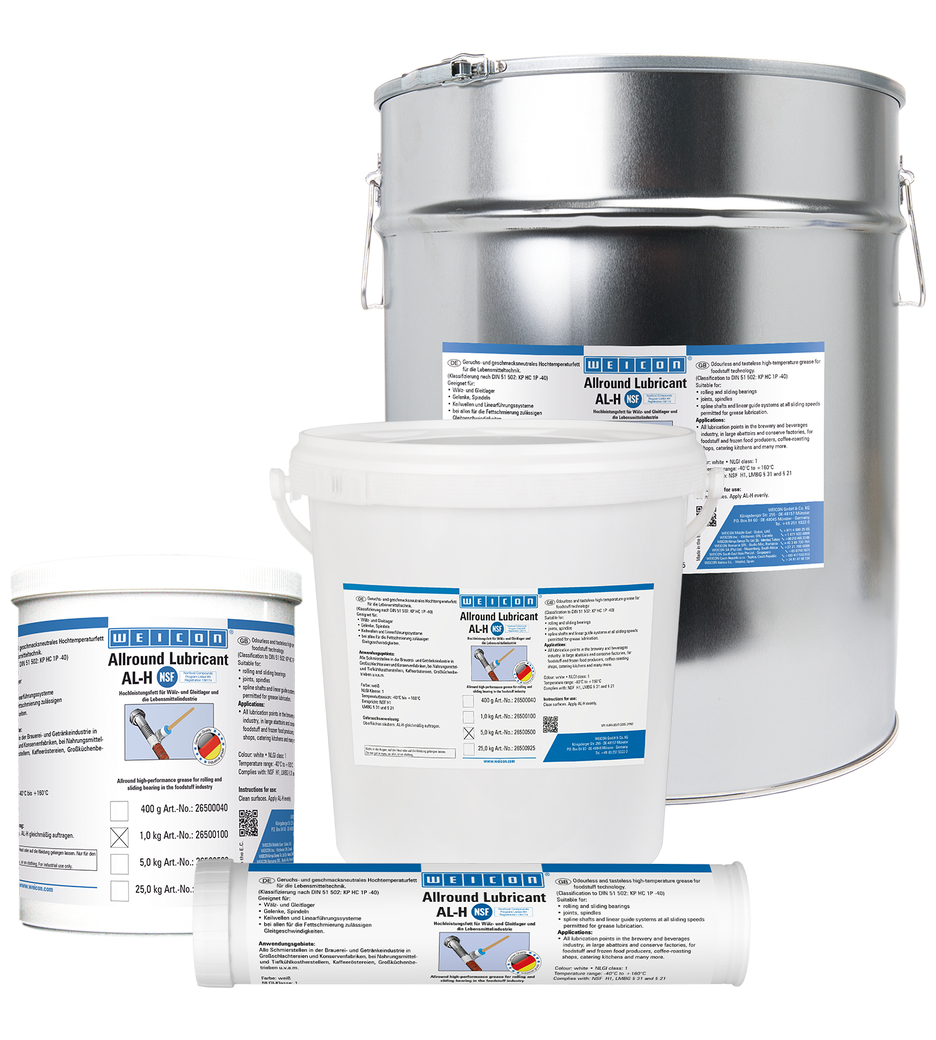WEICON高效润滑脂AL-H适用于滚动轴承、滑动轴承、关节接头、主轴、花键轴和线型导轨系统,在所有允许使用脂类润滑剂的滑动速度下均适用。该产品采用特殊配方,已通过美国国家卫生基金会NSF的H1食品级认证,因而特别适用于食品工业领域。