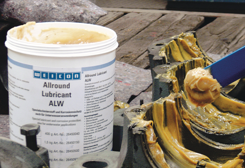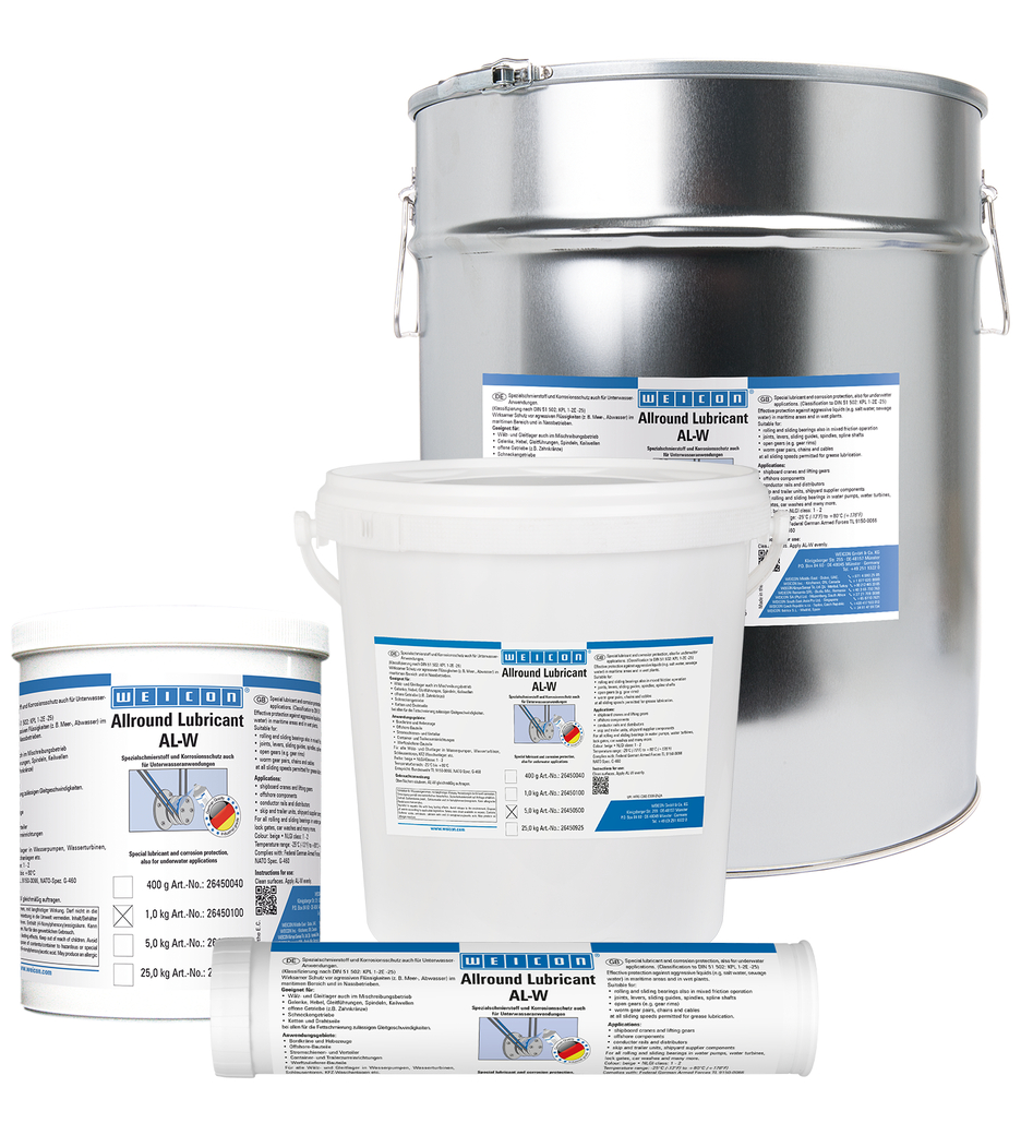WEICON高效润滑脂AL-W能提供有效保护,防止相关部件免受(诸如海水和废水等的)腐蚀性液体侵蚀,适用于海事及潮湿作业领域。此款润滑剂可广泛用于滚动与滑动轴承(即使在混合摩擦运转中也适用)、关节接头、杠杆、滑轨、主轴、花键轴、开式齿轮、蜗轮、链条和钢索等 处,在所有允许使用脂类润滑剂的滑动速度下均适用。