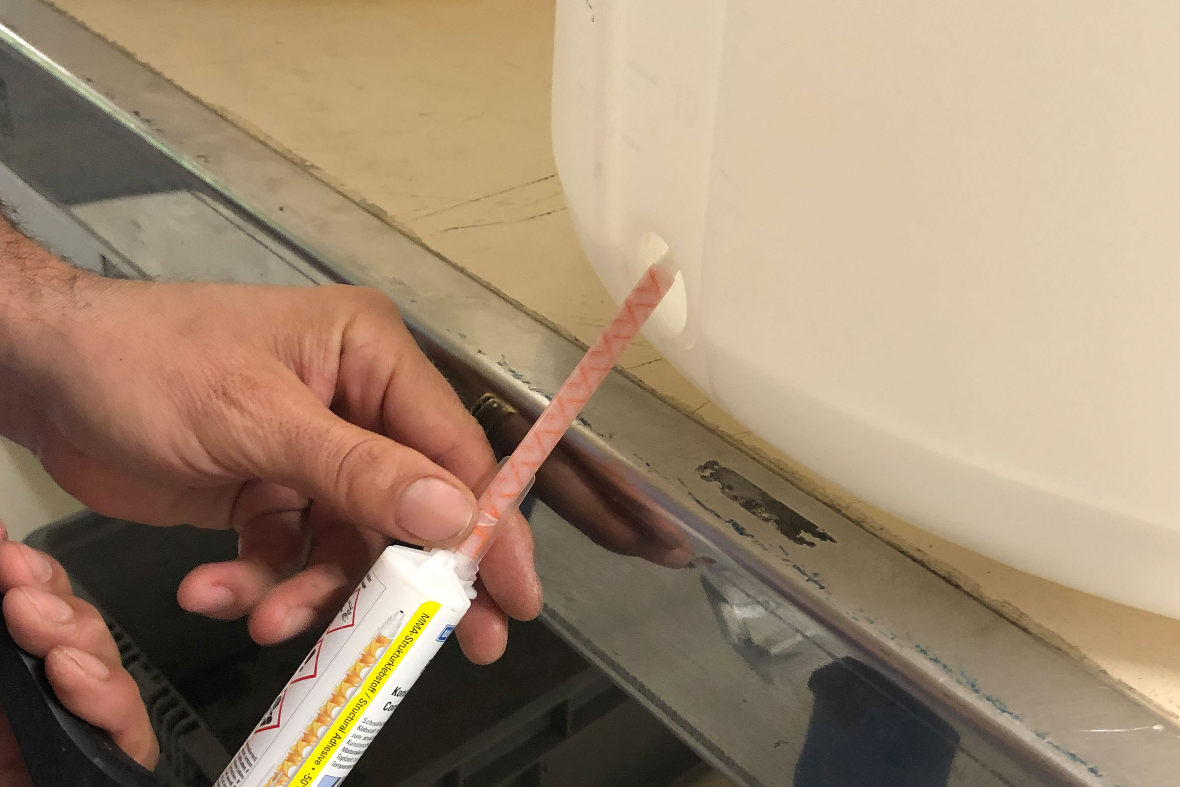 In agriculture, polyethylene feed containers often need to be fitted with taps and sockets to allow efficient dispensing. By using WEICON Easy-Mix PE-PP 50, a reliable sealing and fixing of the connections can be achieved. After drilling the holes and cutting the threads, the surfaces of the tap and socket are thoroughly cleaned with WEICON Surface Cleaner. The adhesive is then applied and the components are securely screwed together.