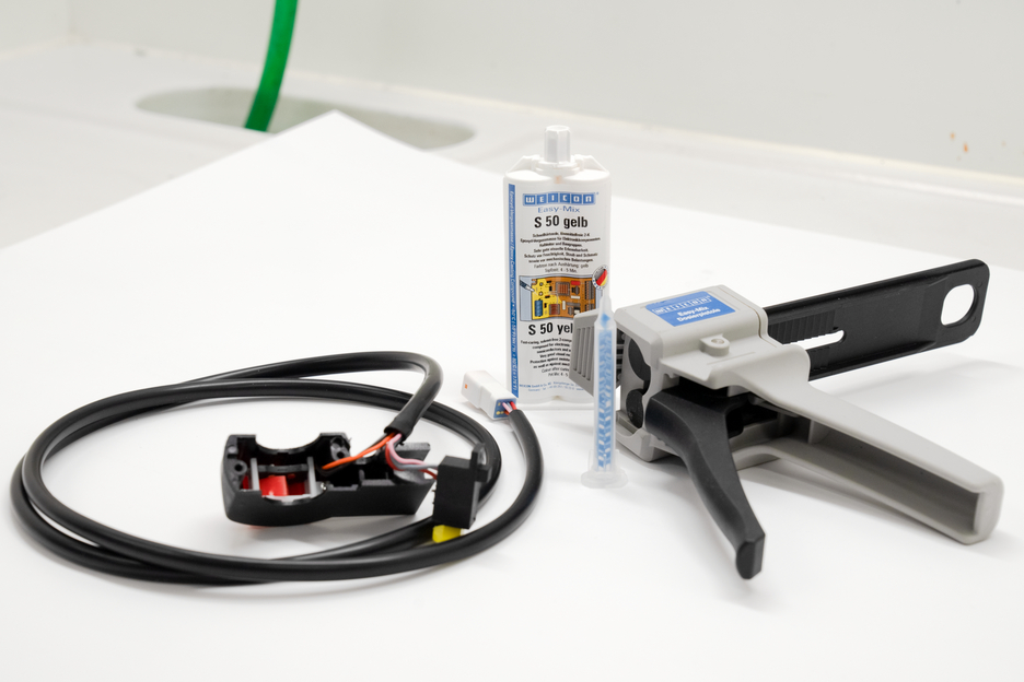 WEICON 易混合型 Easy-Mix S 50 黄色款是一种高活性灌封材料,其附着力强、固化迅速,因而亦可作为粘合剂来使用。该产品以环氧树脂为基材,耐高温可达+180 ℃,呈半流体质地,可自流平,固化迅速且抗冲击。该款灌封材料的可操作时间较短,仅为4至5分钟。该产品能够极好地附着在各种材料表面上,比如:金属、塑料、玻璃纤维增强塑料、木材、玻璃、陶瓷和石材。在电子领域,它可用来保护电子元件、半导体和组件。它可以保护组件,使其免受潮湿、灰尘和污垢,以及机械负载的影响。该产品适用于诸多领域,比如:电子技术和电子工业领域以及电缆连接处的灌封工作,再比如:隔离及绝缘技术、金属加工、容器和仪器制造、阀门制造,以及通风和空调技术领域的相关工作。由于呈醒目的黄色,易混合型 Easy-Mix S 50 黄色款的使用有助于视觉检测。该灌封材料以Easy Mix易混合型的双管包装,操作便捷。 操作50ml装的Easy Mix系列产品时,需使用易混合型胶枪 D50。