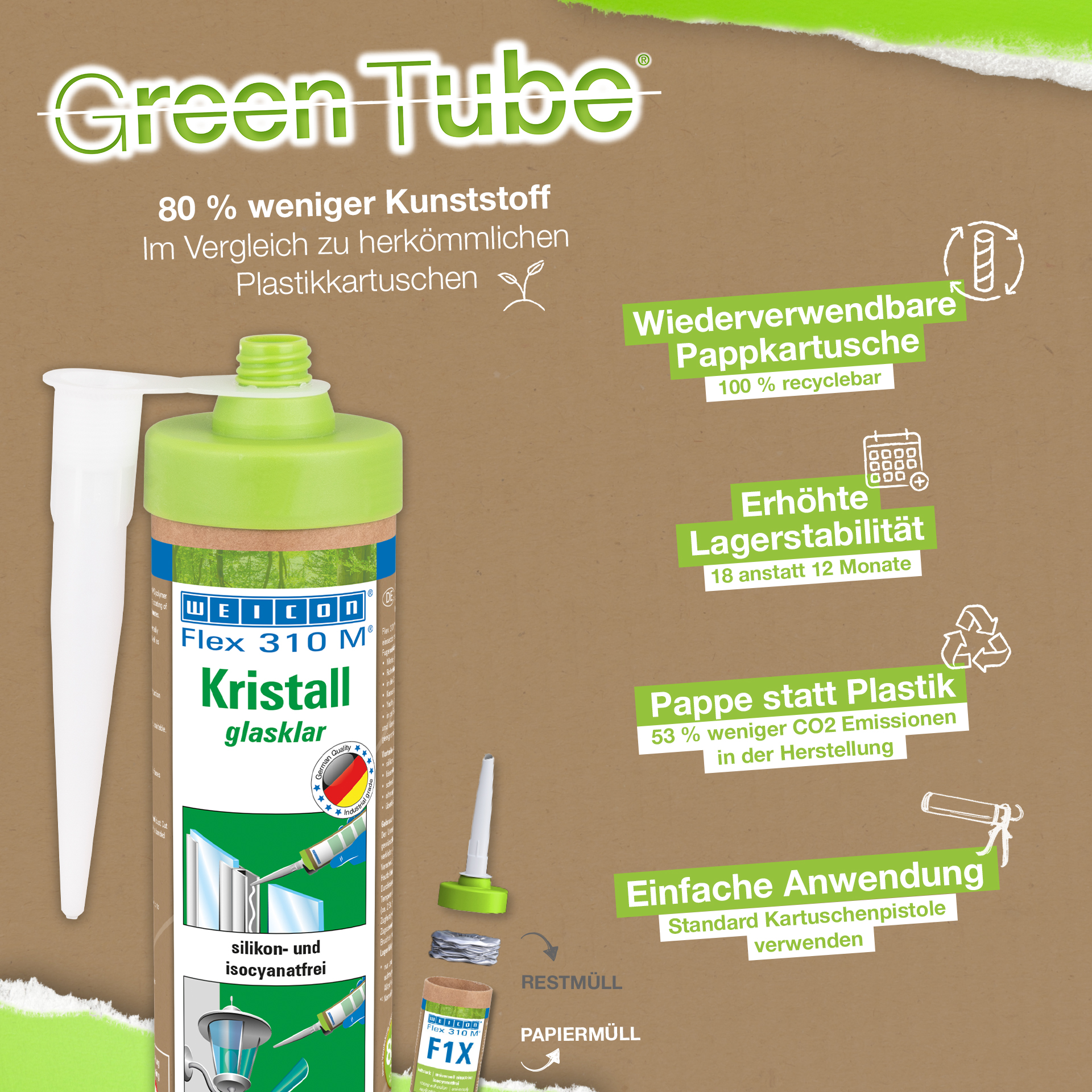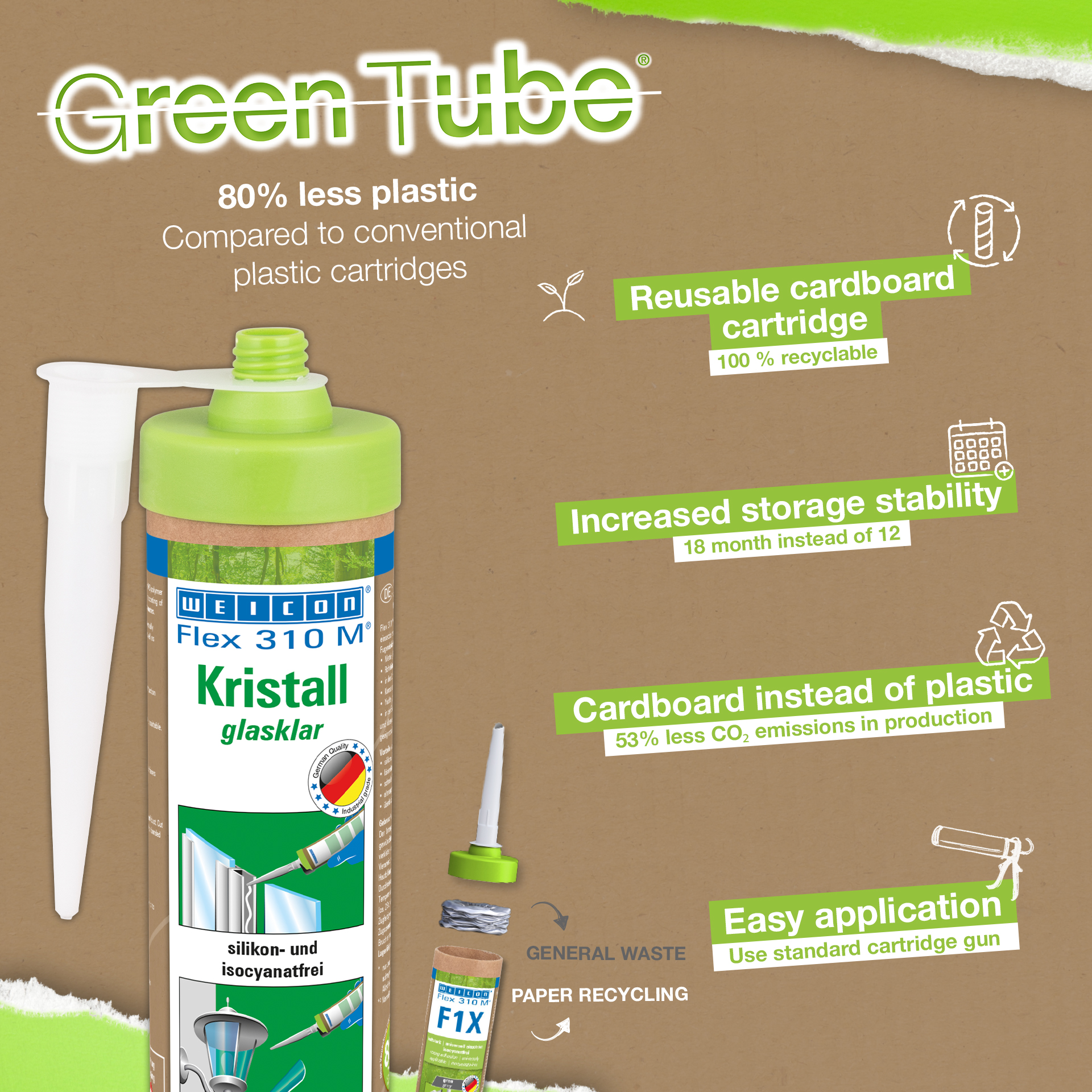 WEICON Flex 310 M 透明款密封胶附着力出色、湿润时可涂漆、固化后可研磨,同时还具有突出的耐老化性和良好的抗紫外线能力。它能够抵抗淡水和咸水,不含硅、异氰酸酯、卤素或溶剂。 WEICON Flex 310 M 透明款通过欧洲食品级认证(ISEGA),可用于食品行业。它是一款以MS聚合物为基础成分的弹性密封胶,适用于玻璃、PC*、PMMA*和丙烯酸玻璃*、金属、多数塑料、陶瓷、木材和石材等的粘接。 该产品固化后完全透明,尤其适用于需要隐形粘接的工况。FLEX 310 M 透明款能够用于塑料加工、金属加工、设备制造、通风和空调系统、电气和照明设施、展台搭建及其他不允许或不建议使用硅胶或含硅产品的工况。 (*= 只允许在无张力条件下进行粘接)