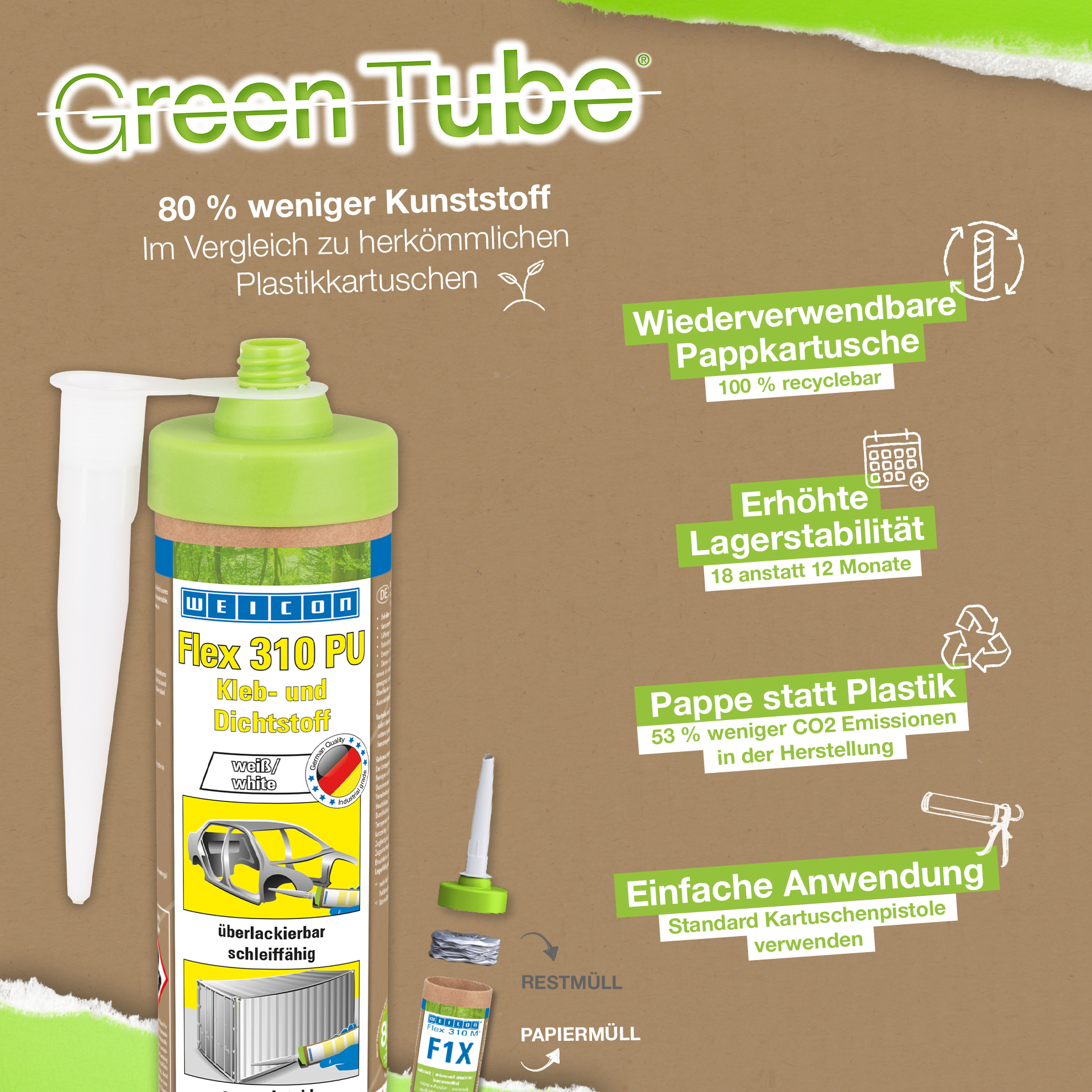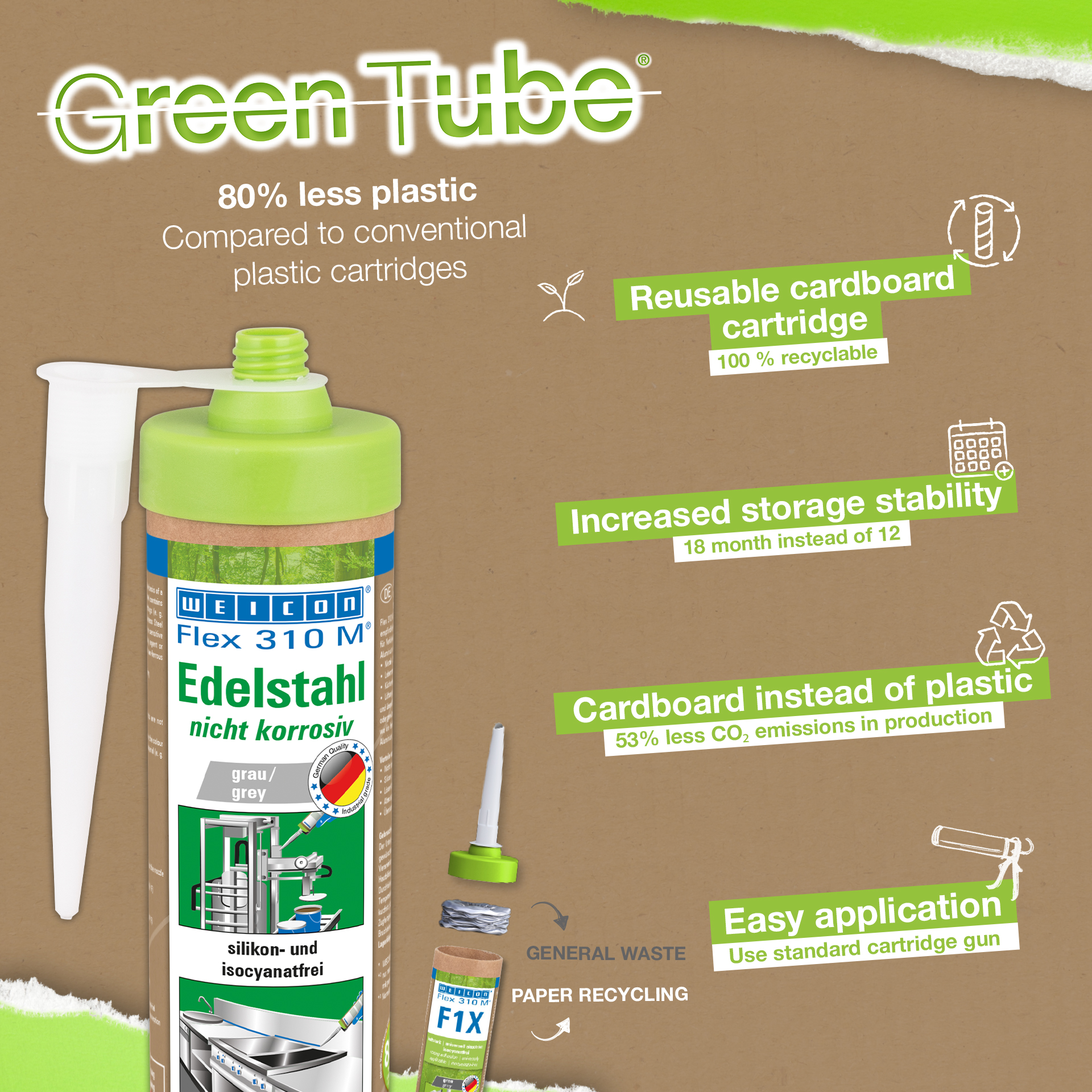 WEICON Flex 310 M® 不锈钢专用胶密封胶无腐蚀性、强度大、湿润时可涂漆、固化后可研磨,同时还具有突出的耐老化性和良好的抗紫外线能力。它能够抵抗淡水和咸水,不含硅、异氰酸酯、卤素或溶剂。 WEICON Flex 310 M® 不锈钢专用胶通过欧洲食品级认证(ISEGA),能够用于食品行业。 WEICON Flex 310 M® 不锈钢专用胶是一款以MS聚合物为基础的弹性密封胶,适用于粘接和密封各种金属(如不锈钢、铝和有色金属)。 WEICON Flex 310 M® 不锈钢专用胶能够用于金属制造、容器与仪器制造、食品工业、厨房及卫生领域、通风和空调系统以及其他不允许使用硅胶或含硅产品的工况。