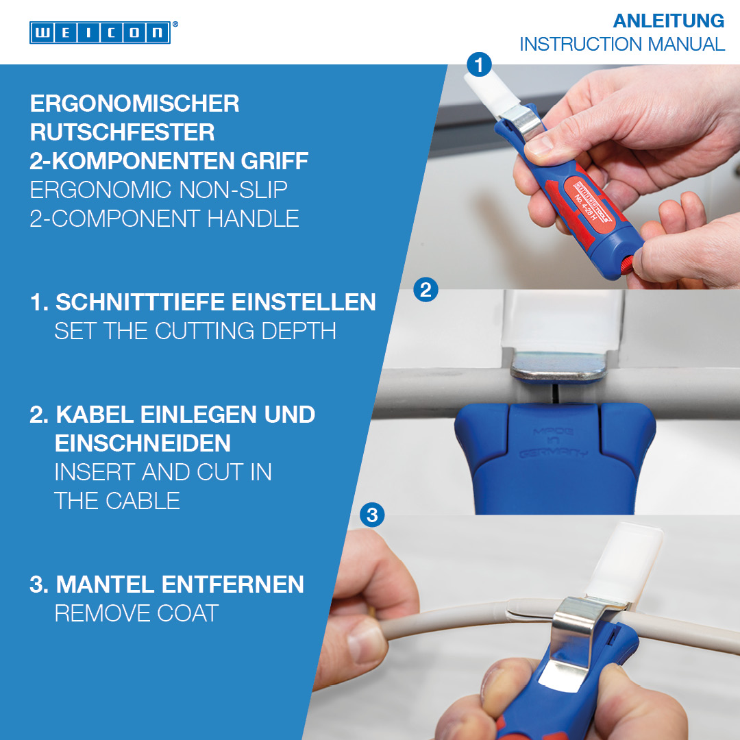 注意:所有WEICON剥线工具系列产品仅可用于无电势、无压力的电缆及电线的操作。