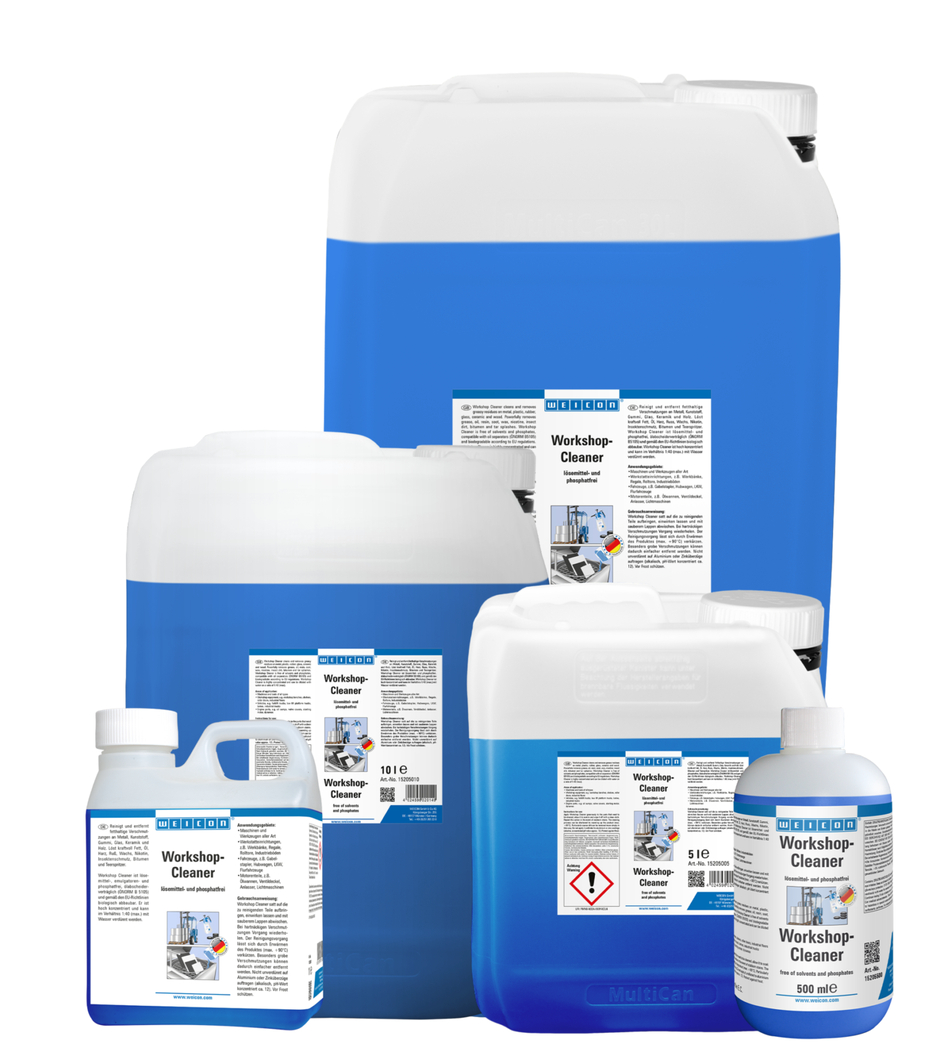 WEICON 车间清洁剂适用于所有金属、塑料、橡胶、玻璃、陶瓷和木材。它能去除油脂、油污、树脂、铁锈、蜡、尼古丁、昆虫粪便、沥青和柏油斑点。 车间清洁剂不含溶剂、乳化剂和磷酸盐;可用于油分离器(ÖNORM B 5105);依据欧盟规定,可生物降解。该产品高度浓缩,可以按最多1:40的比例与水进行稀释。 车间清洁剂含无泡活性剂,除了用人工方式清洗之外,还可使用高压清洁器、零件洗涤机和分装喷壶(如分装喷壶WPS 1500)进行操作。
