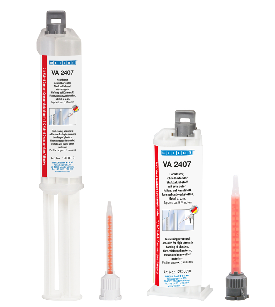 WEICON 瞬间胶 VA 2407是一款无色透明固化的双组份氰基丙烯酸盐粘合剂,适用于各种材料,同材和异材粘接均可。它能很好地粘附在许多塑料(如聚碳酸酯)、钢、不锈钢、铝、陶瓷、玻璃和橡胶上。新产品集合了瞬间胶和双组份粘合剂的优势。该结构胶强度高、固化快,25分钟后即可打磨与涂漆。它能抵抗风化、耐许多腐蚀性的化学品、抵抗冲击和振动。该产品的耐温范围为 -20 °C 至 +120 °C (-4° bis +248 °F)。根据待粘接材料的几何形状,VA 2407可以填补宽达5毫米的缝隙。由于其固化迅速且耐冲击,它特别适用于粘接例如塑料和橡胶等材质。在结构粘接中,有颜色的胶水往往会影响产品的外观,因此透明款的产品更能发挥其优势。VA 2407 适用于透明塑料的粘接,如亚克力等,同材和异材粘接均可,操作后干净利索且视觉效果好,强度极高。该粘合剂可应用于塑料技术、机器制造、模具及模型制造、金属工业、造船工业、汽车制造、展台搭建等诸多工业领域的各种不同应用方式。